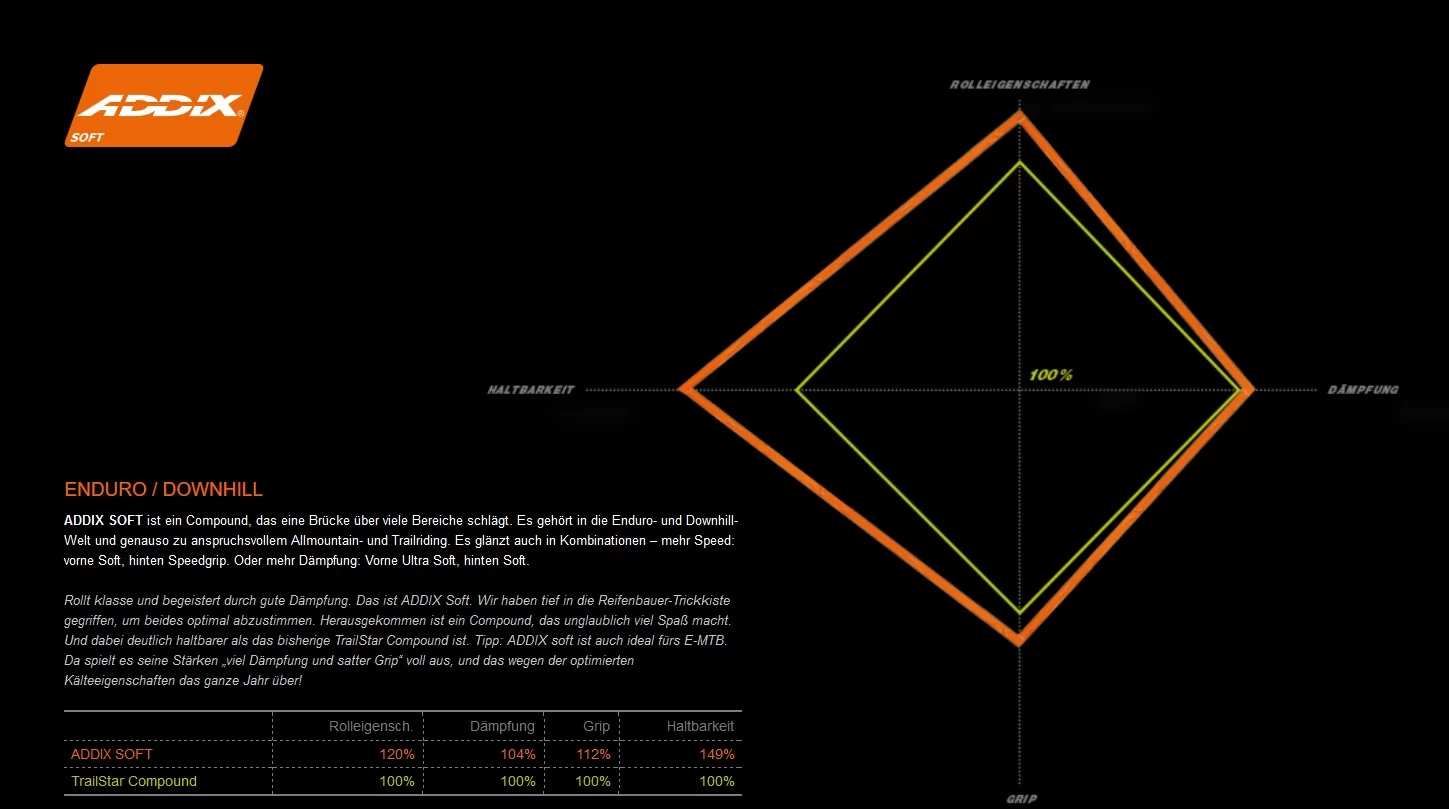 ADDIX SOFT ist ein Compound, das eine BrĂŒcke ĂŒber viele Bereiche schlĂ€gt. Es gehört in die Enduro- und Downhill-Welt und genauso zu anspruchsvollem Allmountain- und Trailriding. Es glĂ€nzt auch in Kombinationen â mehr Speed: vorne Soft, hinten Speedgrip. Oder mehr DĂ€mpfung: Vorne Ultra Soft, hinten Soft. Rollt klasse und begeistert durch gute DĂ€mpfung. Das ist ADDIX Soft. Wir haben tief in die Reifenbauer-Trickkiste gegriffen, um beides optimal abzustimmen. Herausgekommen ist ein Compound, das unglaublich viel SpaĂ macht. Und dabei deutlich haltbarer als das bisherige TrailStar Compound ist. Tipp: ADDIX soft ist auch ideal fĂŒrs E-MTB. Da spielt es seine StĂ€rken âviel DĂ€mpfung und satter Gripâ voll aus, und das wegen der optimierten KĂ€lteeigenschaften das ganze Jahr ĂŒber!