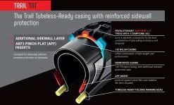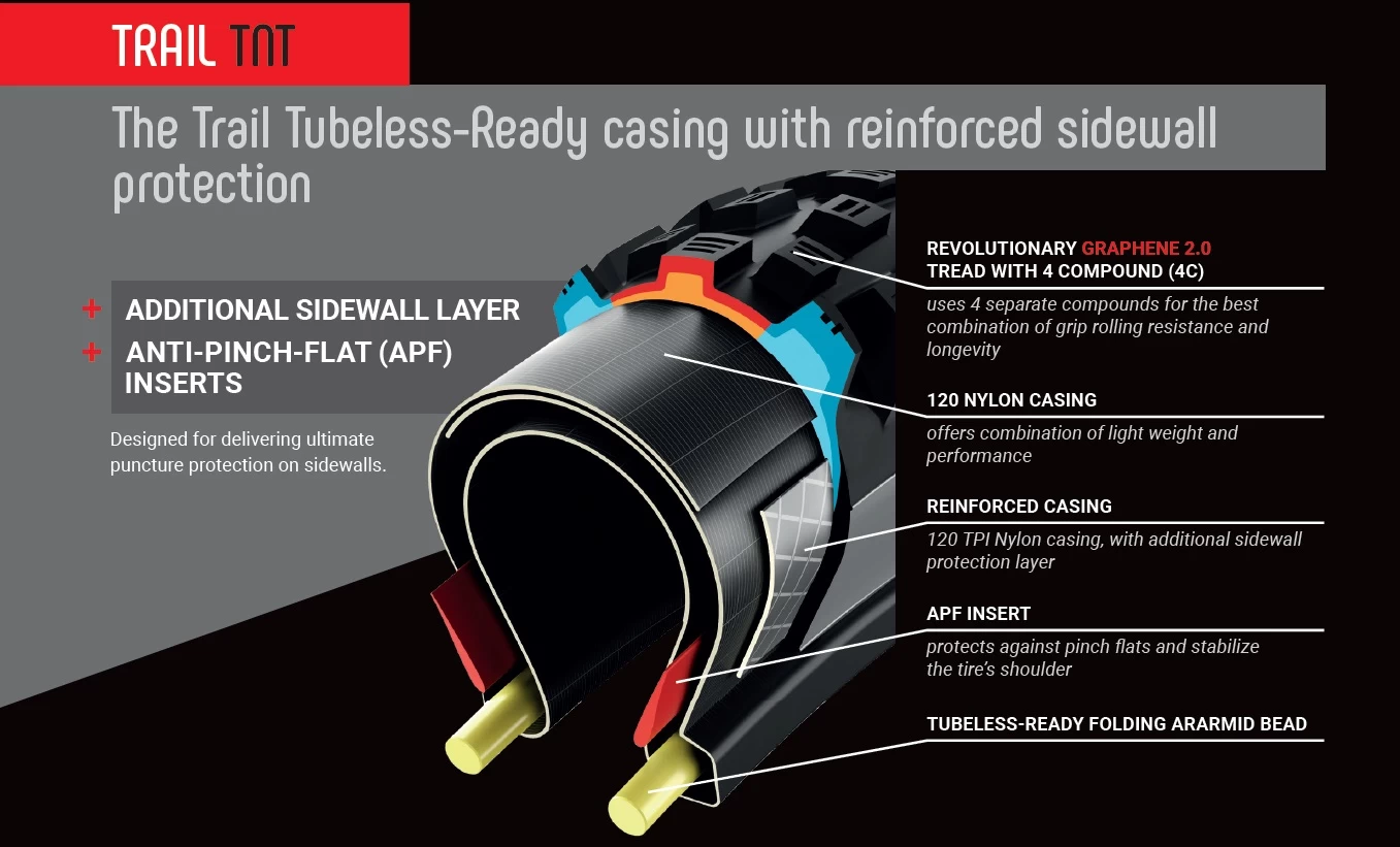 Die TNT-Konstruktion von Vittoria bietet ultimativen Pannenschutz an den SeitenwĂ€nden, denn sie hat eine extra Schutzschicht in der Wand des Reifens. Das Trail TNT Casing macht den Reifen etwas schwerer, dafĂŒr aber viel robuster. Vittoria TNT (Tube/No-Tube) Reifen sind bis zu 100 g leichter als herkömmliche Tubeless-Reifen, trotz verstĂ€rkten Nylongewebe SeitenwĂ€nden mit massiver Schnittfestigkeit.